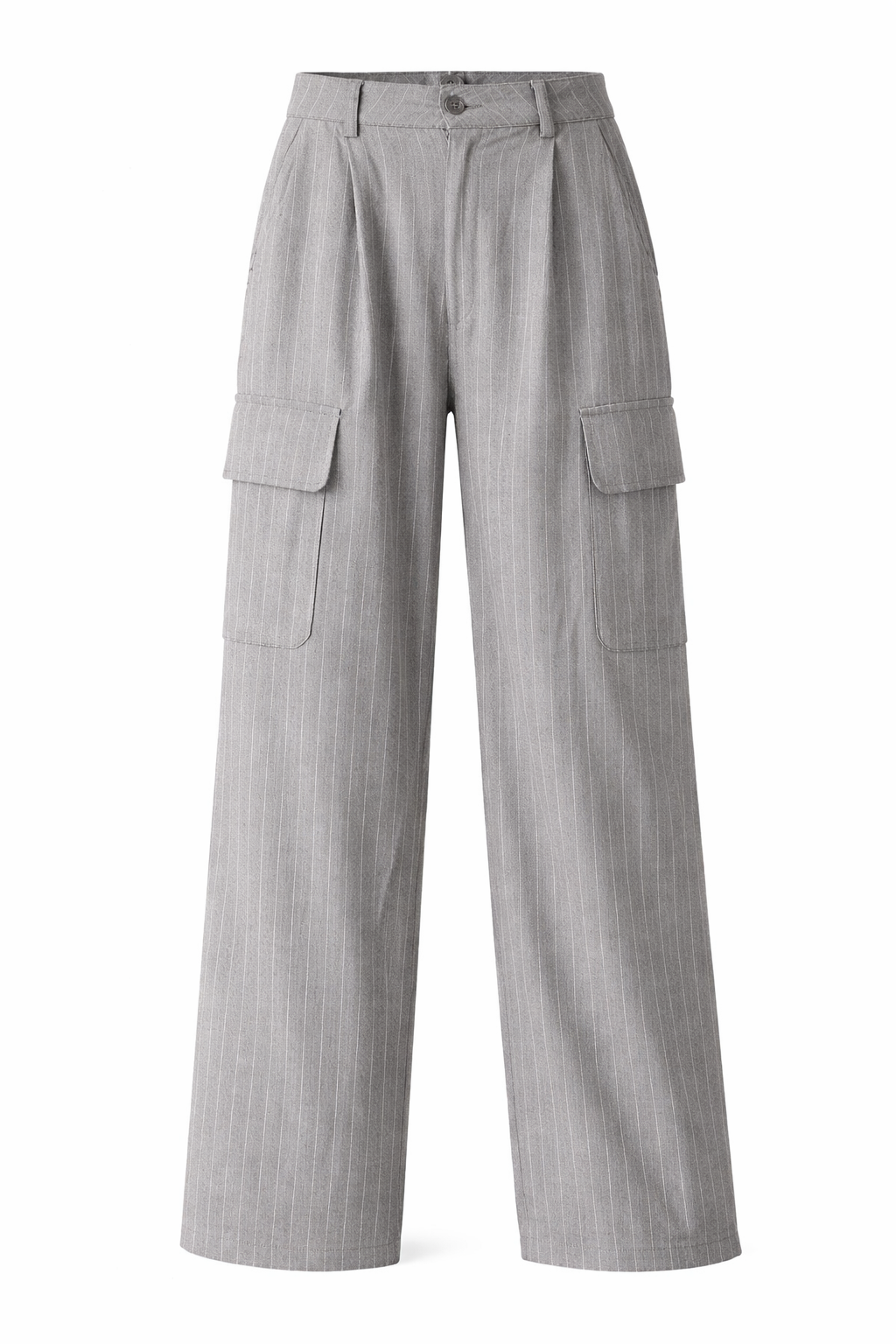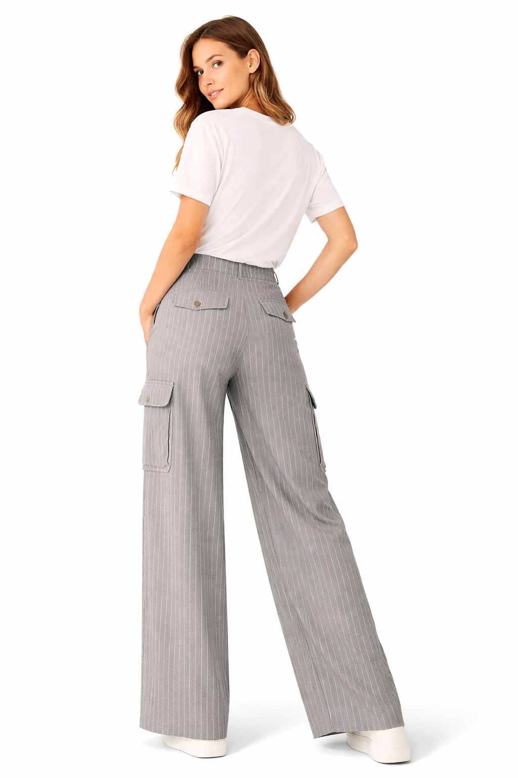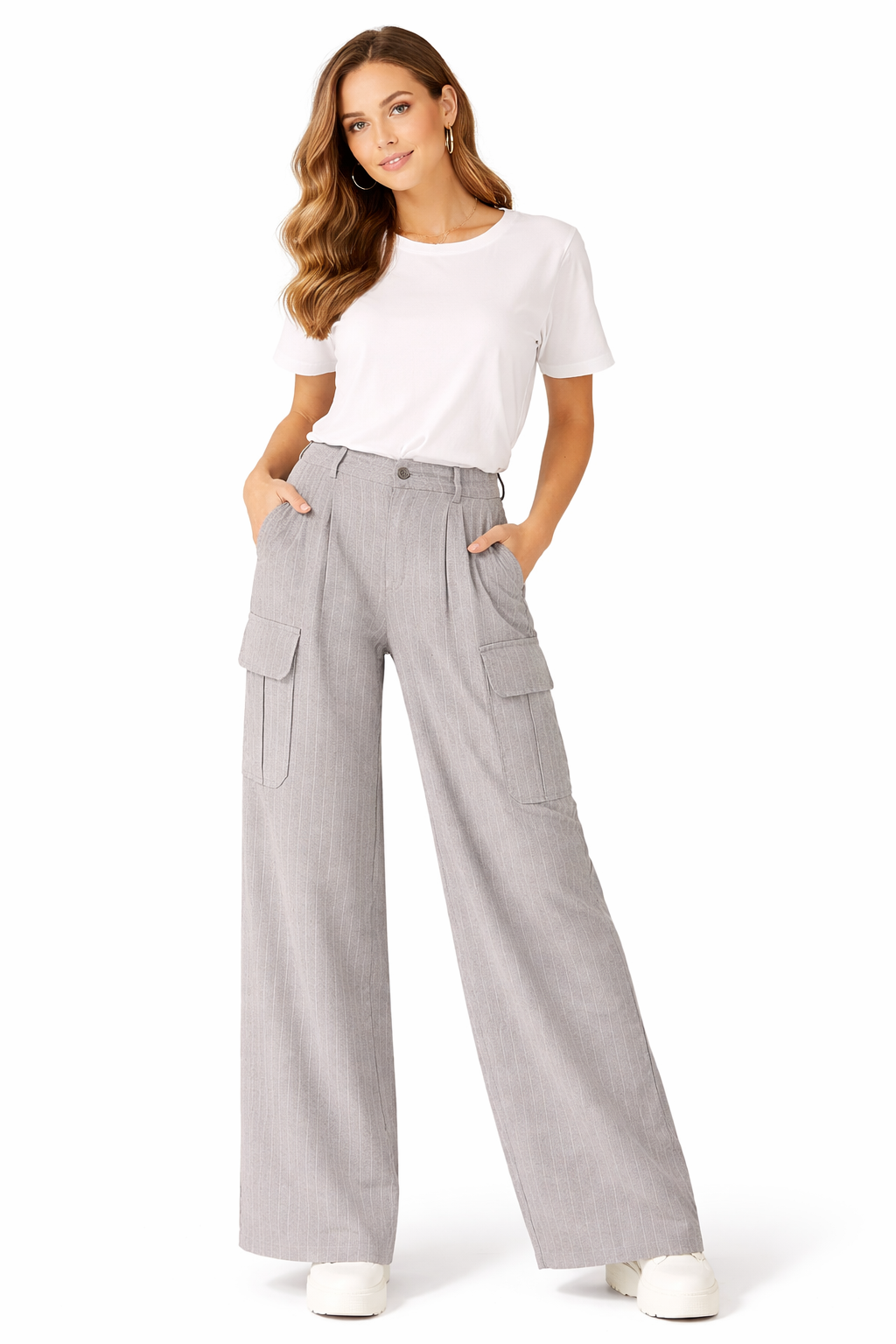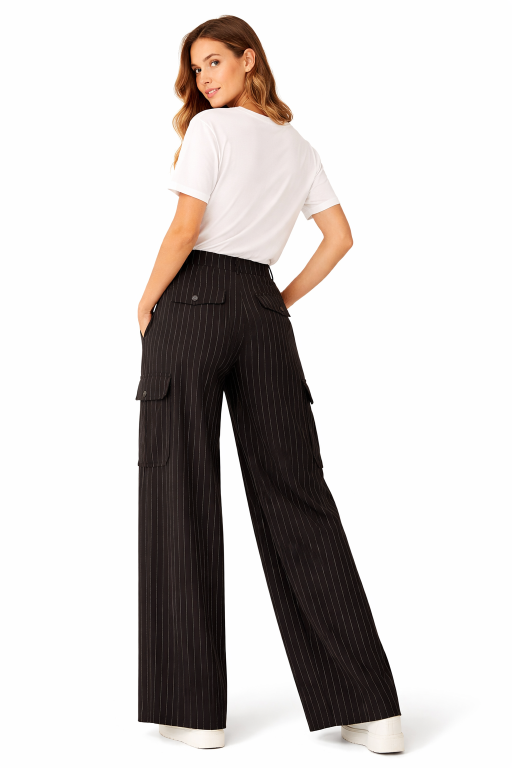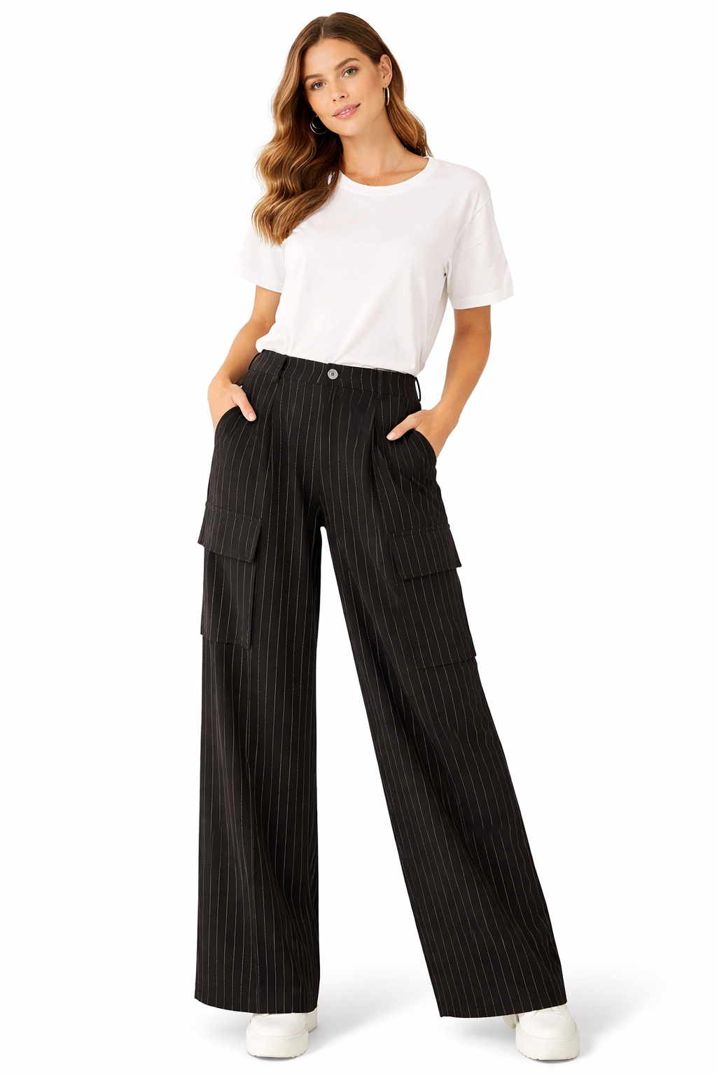 Rkncollection ✨ Ürün Özellikleri %95 Polyester %5 Elastan kumaş Esnek ve rahat kullanım Kırışmaya dayanıklı yapı Yüksek bel kesim Geniş paça (wide leg) form Yanlarda kapaklı kargo cep detayı İnce çizgili (pinstripe) modern tasarım Önden düğme ve fermuar kapama