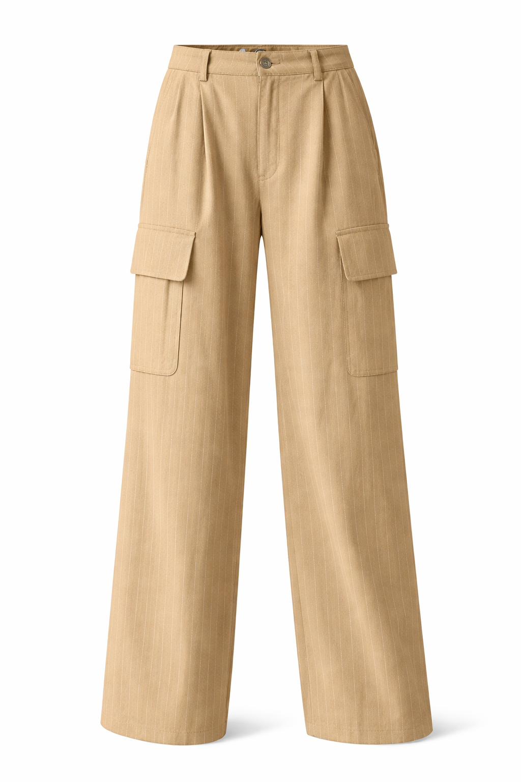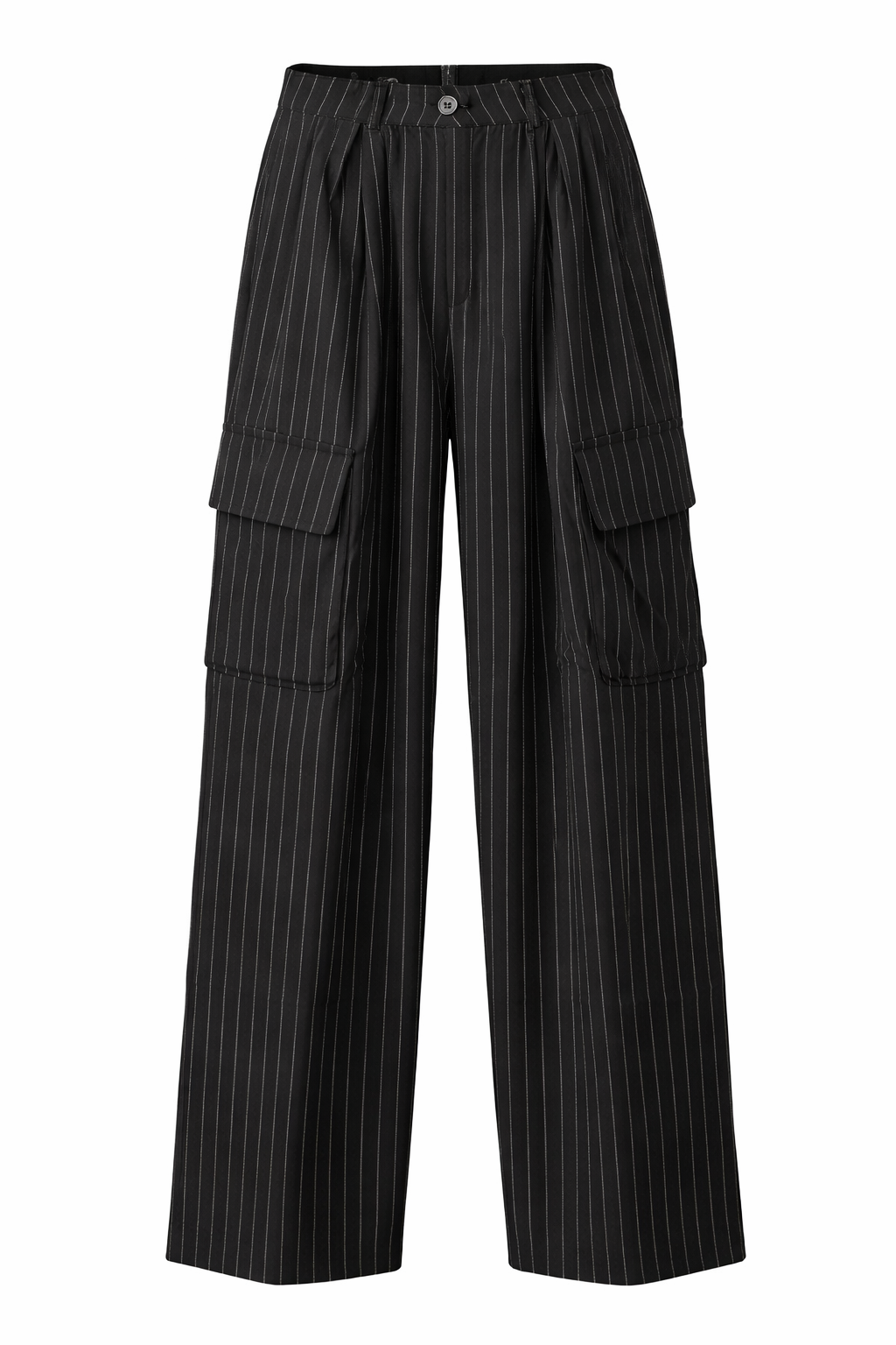 Rkncollection ✨ Ürün Özellikleri %95 Polyester %5 Elastan kumaş Esnek ve rahat kullanım Kırışmaya dayanıklı yapı Yüksek bel kesim Geniş paça (wide leg) form Yanlarda kapaklı kargo cep detayı İnce çizgili (pinstripe) modern tasarım Önden düğme ve fermuar kapama